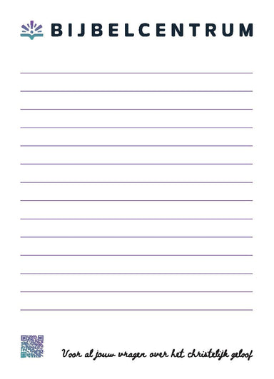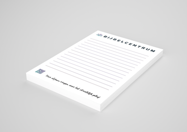 Mini schrijfblokje met Bijbelcentrum logo op A6 formaat, 50 vel per blok. Je kunt ze los uitdelen tijdens een evangelisatieactiviteit of ter onders...